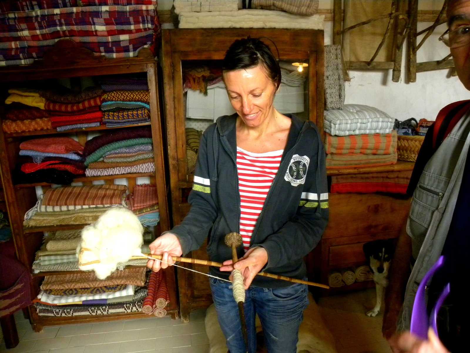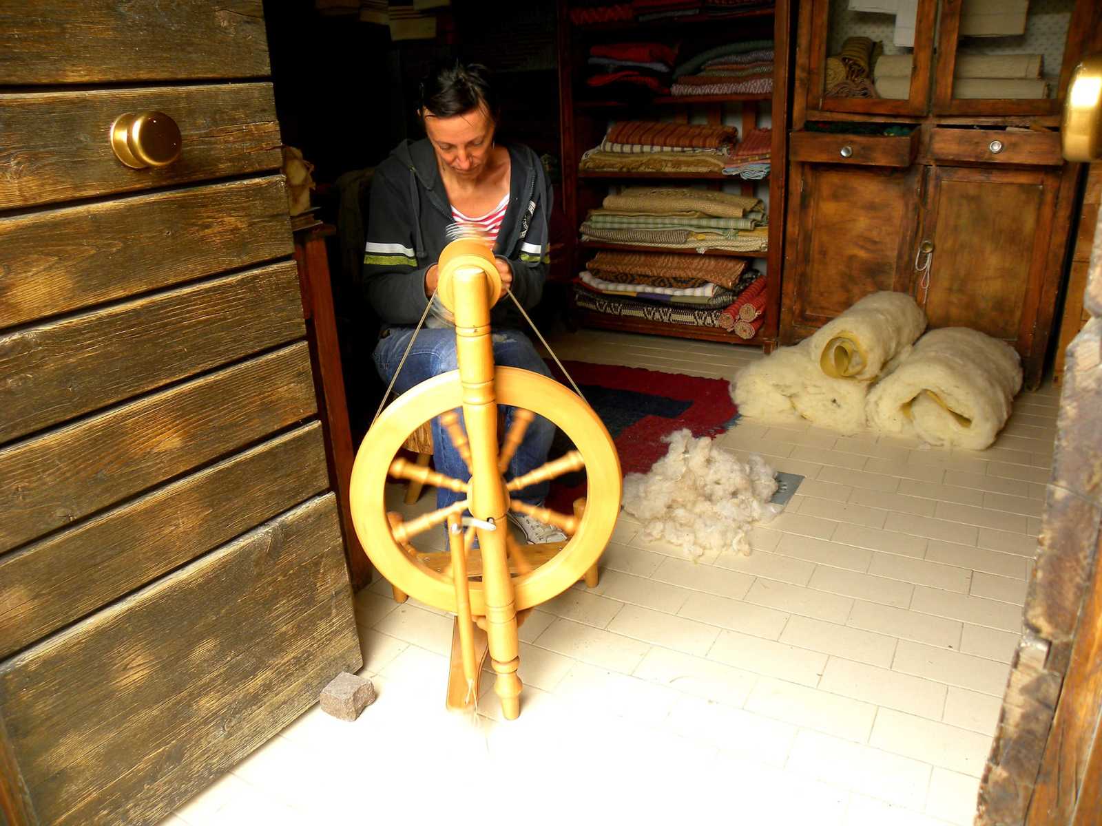 Oggi invece, non può certo mancare la visita alla bottega artigianale di filati gestita dalla bravissima Assunta Perilli, dove vengono esercitate antiche pratiche di lavorazione attraverso tecniche secolari per la tintura di fibre naturali come lana, lino e canapa, utilizzando il cosiddetto “Guado” (Isatis Tinctoria). Trattasi di una infiorescenza costituita da piccoli steli di colore azzurro-blu porpora tra fiori e petali gialli, conosciuta come una delle più antiche piante tintorie peraltro molto comune in queste montagne.