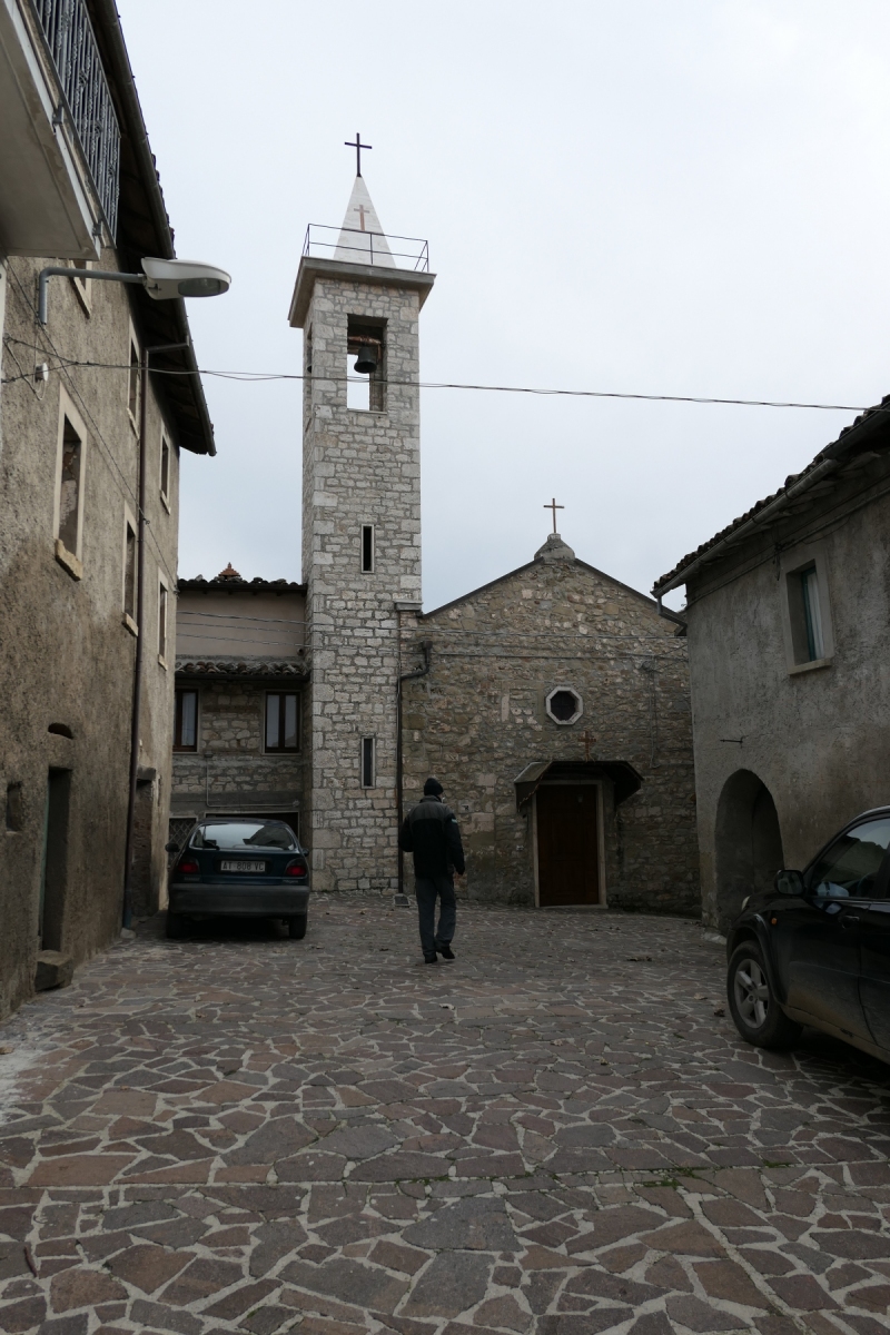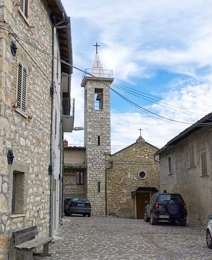 Si scorge nella parte opposta della valle, lungo una linea ondulata di alture ricoperte di vegetazione dove, in corrispondenza di un’ampia e verdeggiante radura erbosa inclinata, è adagiato un piccolo quanto grazioso profilo di case, raccolte intorno ad un alto e scenografico campanile.